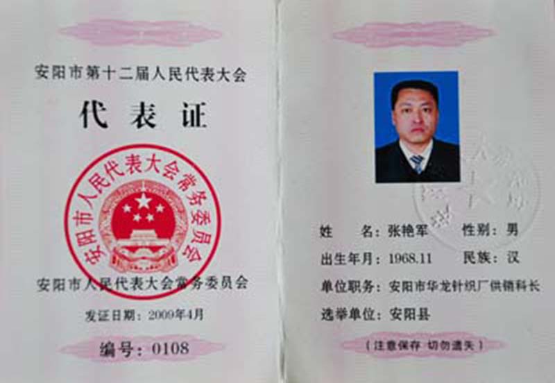 中國人民政治協商會議第十屆安陽縣委員會委員證